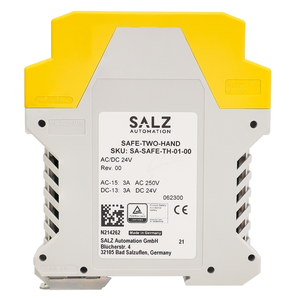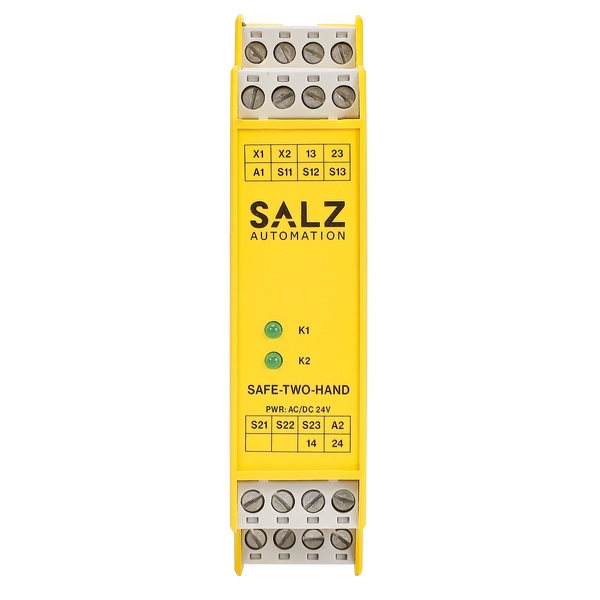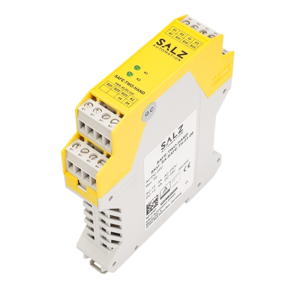 意外啟動或簡單繞過安全功能。 SAFE-TWO-HAND 單元用于連接雙手按鈕,一個常開或